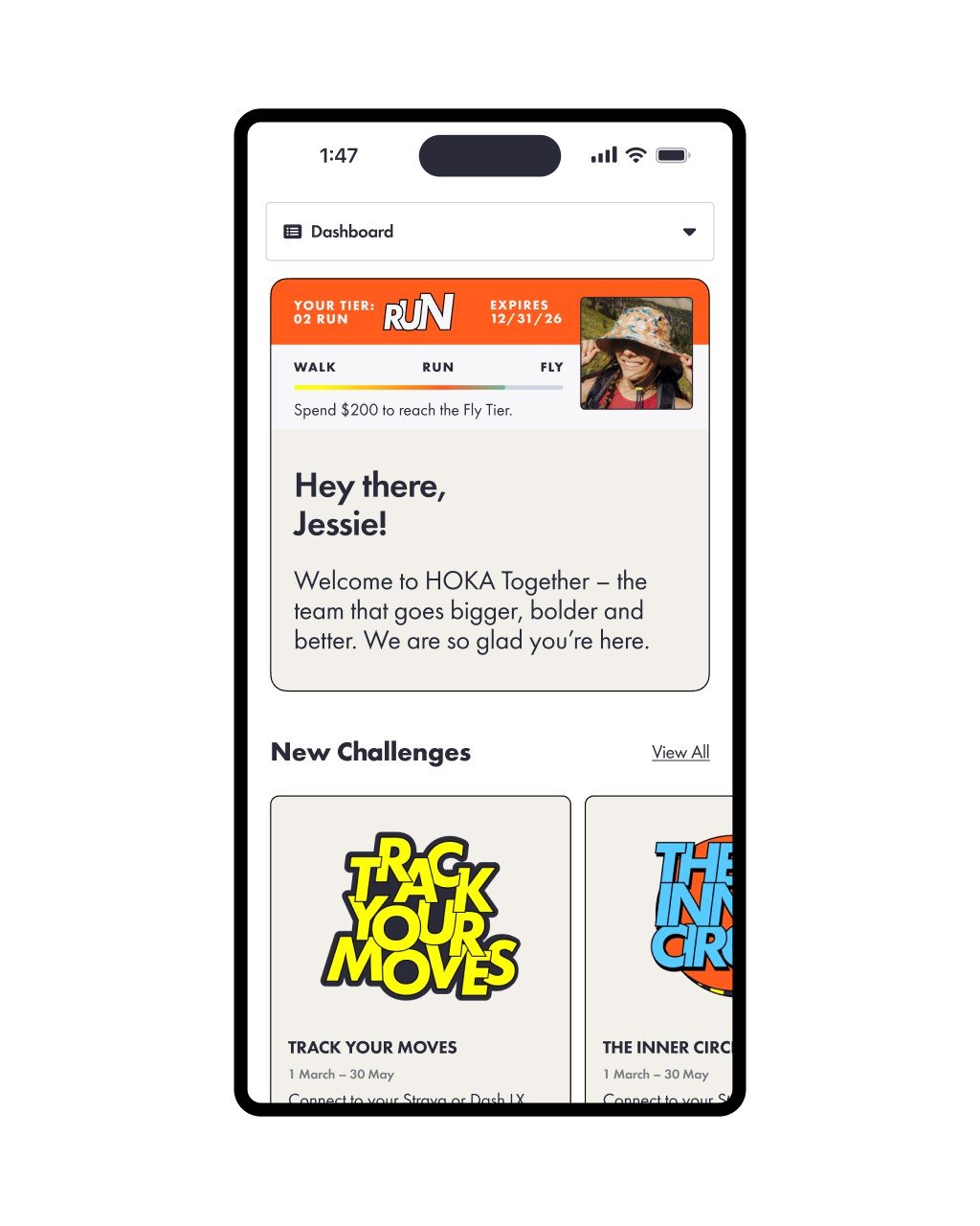 HOKA wanted more than a points program. They needed something that made runners feel like they belonged to something bigger than buying shoes. I designed the brand identity and mobile dashboard that repositioned HOKA as the "run club captain", connecting runners through shared challenges and exclusive rewards. The program shifts loyalty from points to community.